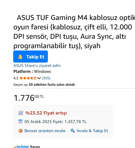 🔥İndirim ASUS TUF GAMING M4 12000 DPI KABLOSUZ GAMING MOUSE 1.294 TL
