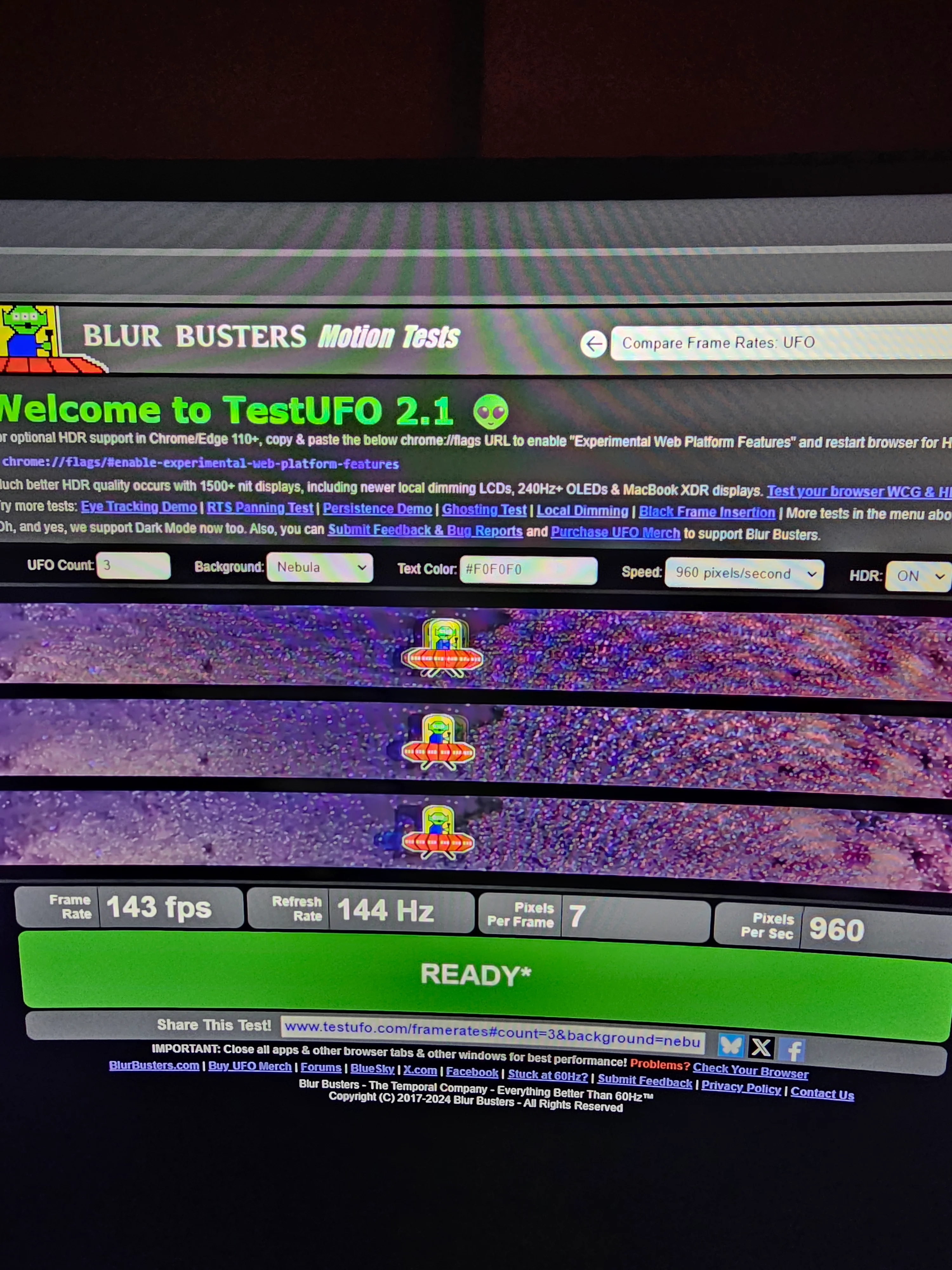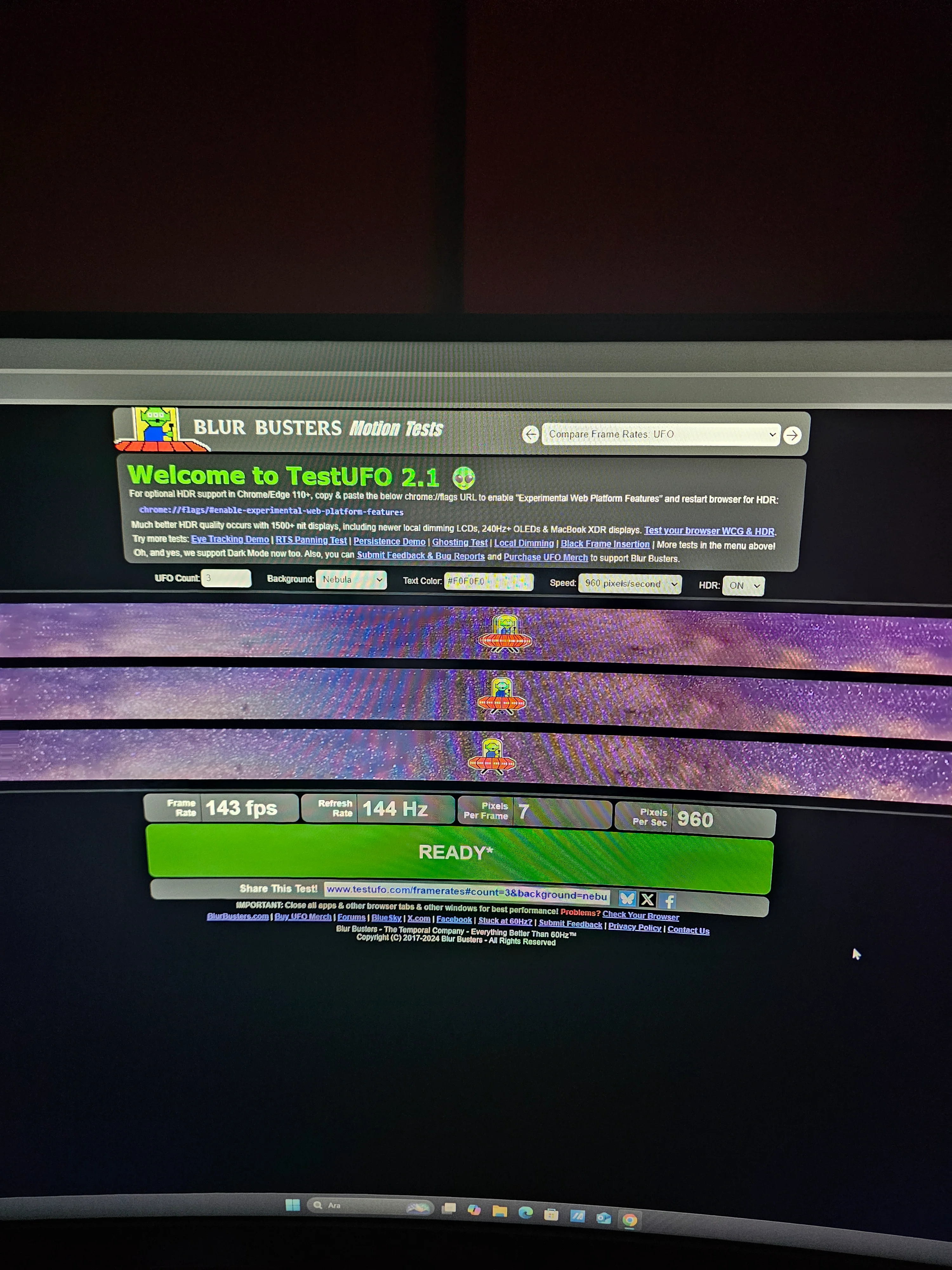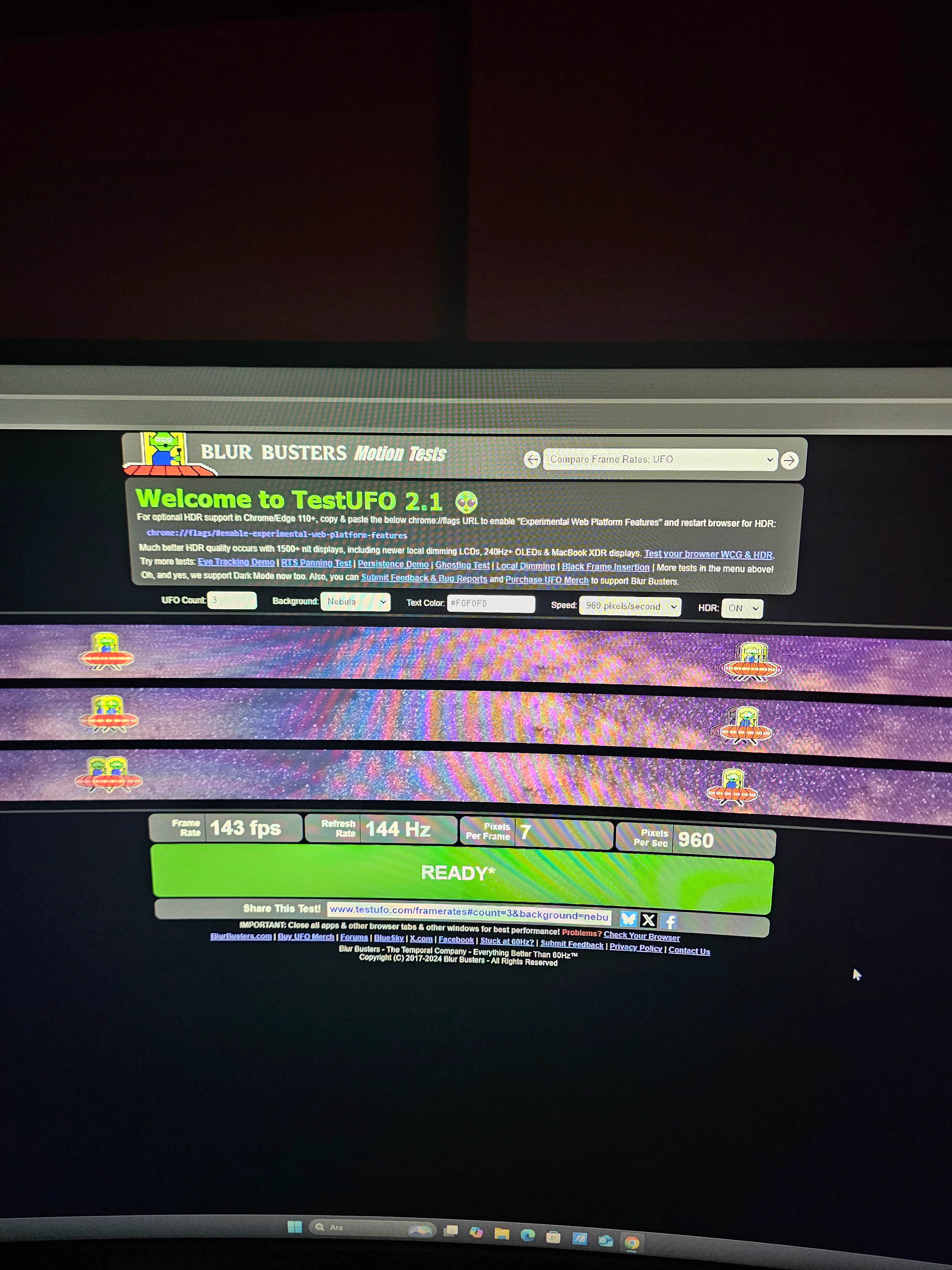 Cevap yazmayı unutmuşum. Ufo testi yanlış şunu yapmanız lazım:Hocam bu monitörü almıştım yukaridaki fiyattan . 1 adet ölü piksel çıktı sol üst köşe tarafında , 2k 144 herz hdr açıkkken ghosting testi yaptım. Overdrive 3 ve overdrive 5 (maks) yapıp öylede denedim . Sizce nasıl. 5800 tl ye gayet idare eder oldugunu dusunuyorum zaten fps oyunu oynamiorum hikaye oyunu oynuyorum . Gündüz olduğu için siyah ekran fotoğrafı atmadım.