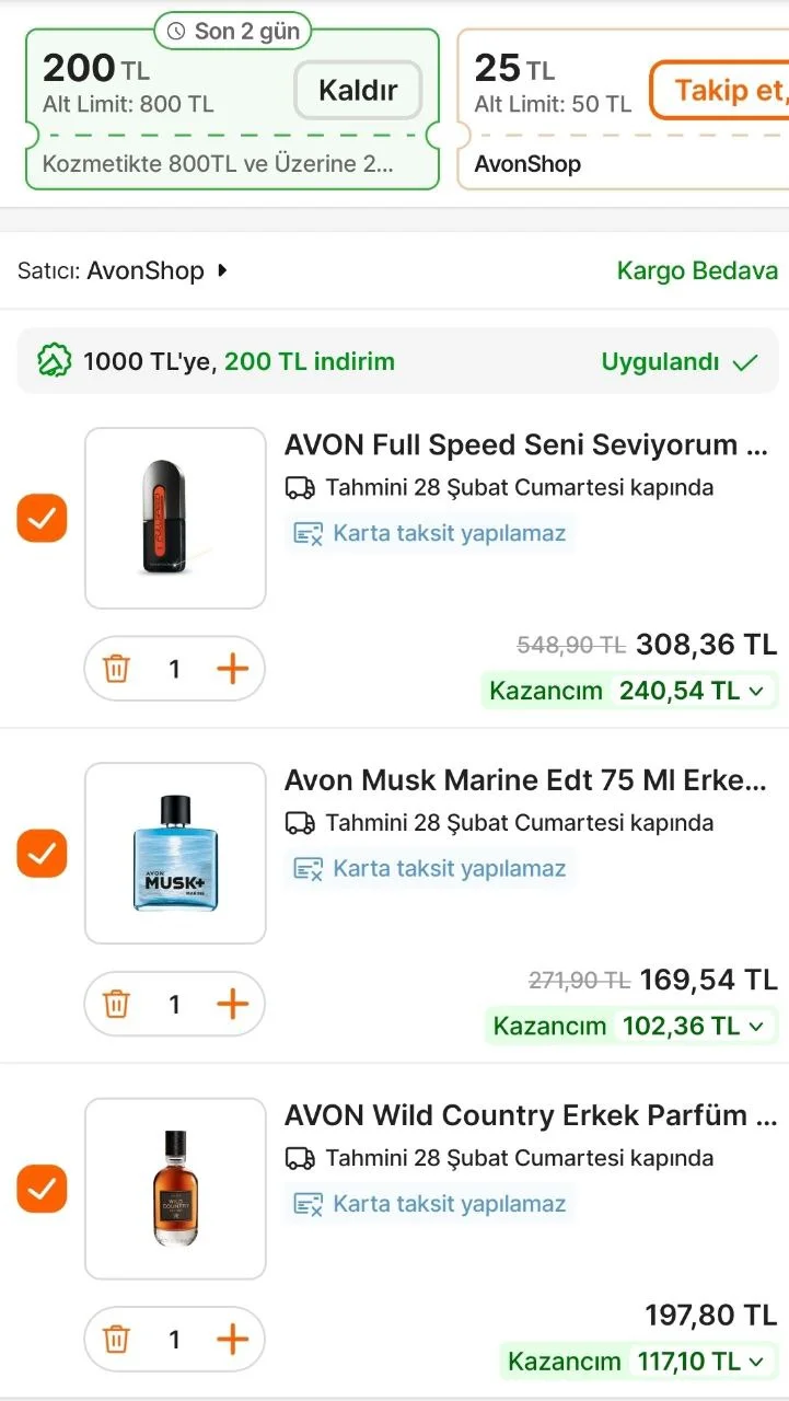 Avon parfümlerde sepette otomatik uygulanan 600/100 ve 1000/200 TL sepet indirimiyle KOZMO200 kodu kombo yapılabiliyor. Bu şekilde parfümlerin çoğu son 1 yılın en düşük fiyatına iniyor. Kodu farklı marka parfüm çeşitlerinde de kullanabilirsiniz. 800/200 TL indirim yapar.
