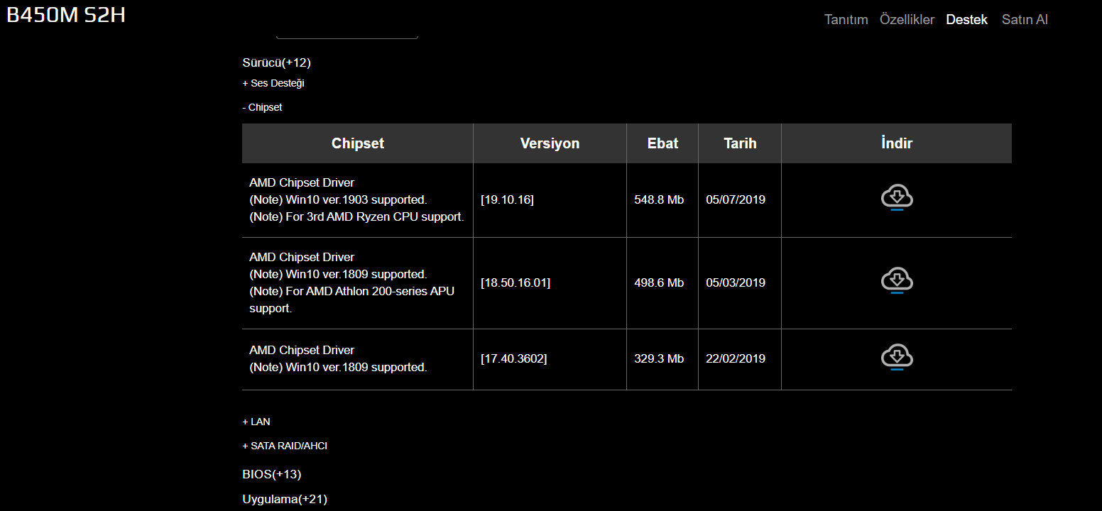 Gigabyte'ın sitesinde b450m s2h için yayınlamış olduğu son chipseti indirdim ama orada ''(Note) Win10 ver.1903 supported.(Note) For 3rd AMD Ryzen CPU support. '' notu yazıyor.