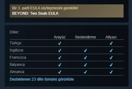 Beyond two souls oyununu indirecektim indirmeden önce Türkçe yama bakayım dedim bulamadım ve oyun hakkında içersinde Türkçe bulunduğunı yazanlarda vardı Türkçe olmadığınıda oyunun kendisinde varmı yokmu türkçe?
