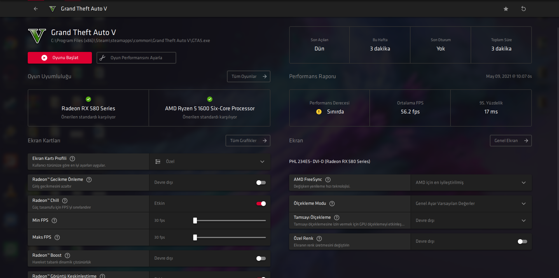 amd nin kendi programında bile gta 5 için uygun olarak gözüküyor