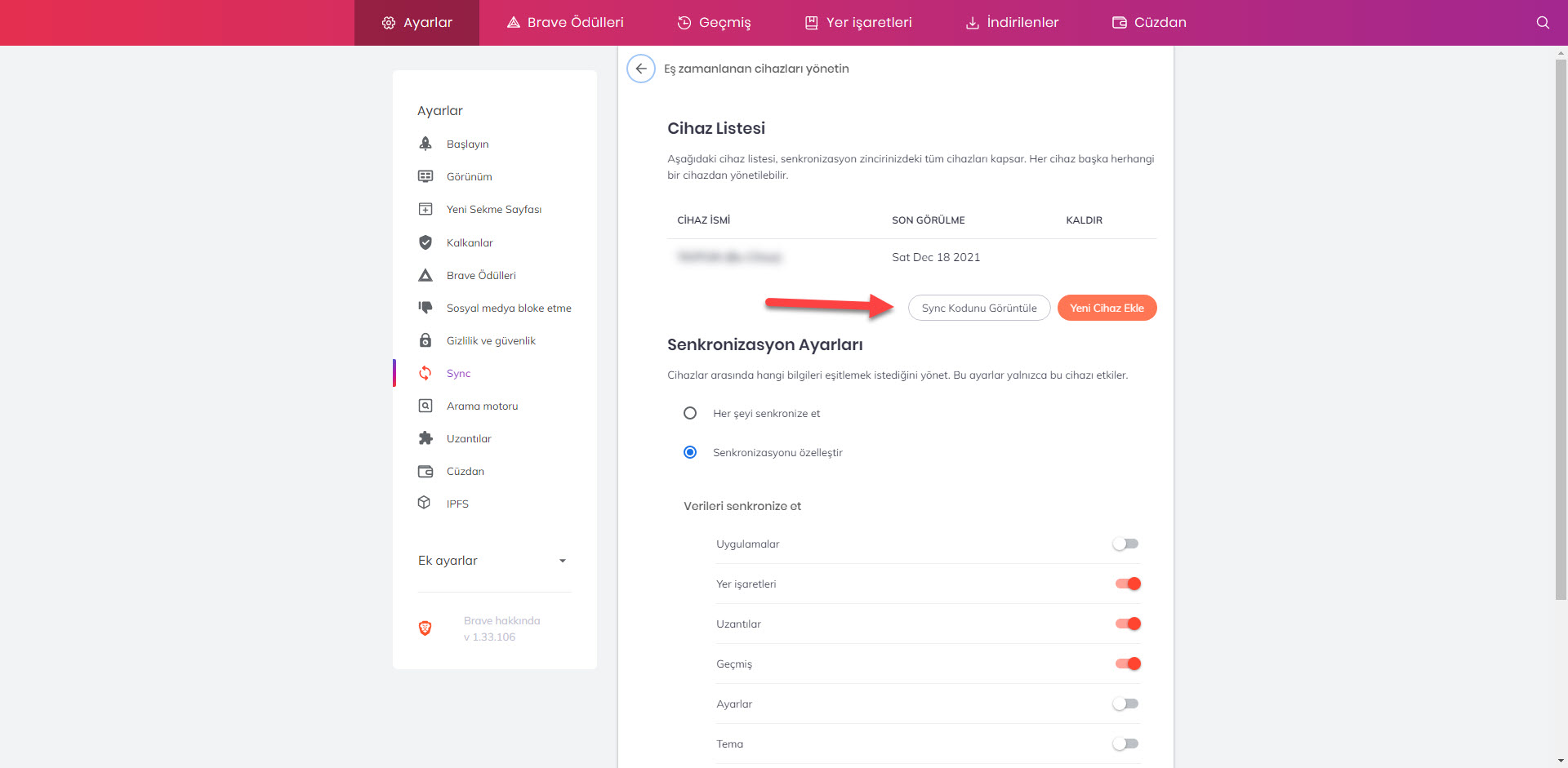 Bunun sync özelliği biraz değişik. Sana bir kod veriyor uzun şeyler yazıyor atıyorum 50 harf içeren onu kopyala bir not defterine kaydet. Format attın mesela brave'yi kurdun diyelim o kaydettiğin kodu kopyala brave'nin sync bölümüne gel yapıştır tamam de sonra kendisi otomatik olarak ne varsa her şeyi getiriyor hemen. Eski kapattığın sekmeleri bile açıyor geri. Biraz karışık ilk başta bende anlamadım ama sonradan çözdüm.