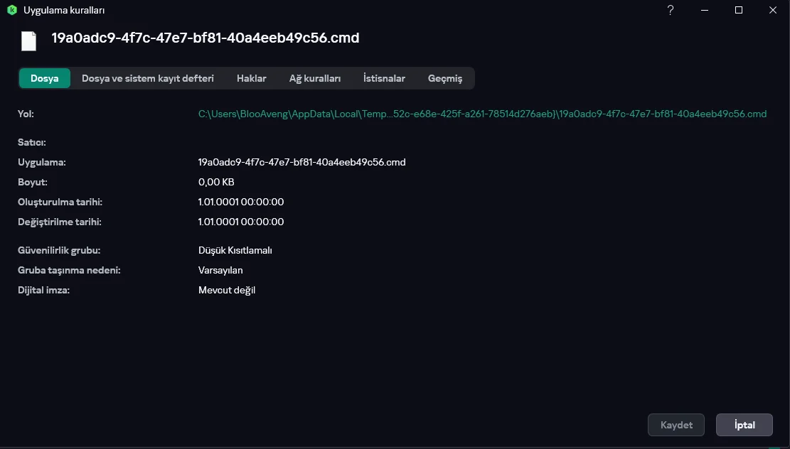 Hocam temp klasörünü bir kaç dakika önce temizlemiştim şimdide öyle bir klasör veya dosya yok ancak düşük kısıtlamada kalmaya devam ediyor normalmidir?Klasör adından cmd dosyasını neyin çalıştırdığını yakalamaya çalışacakta işe yarayacağından şüpheliyim çünkü temp dosyasından dönüş almaya çalışıyoruz sen sistemi yeniden başlatsan büyük ihtimalle silinecek dosyaKaspersky zararlı olmayan sınıfına alıp işaretlemiş zaten sırf cmd diye ama temp bir dosya o yüzden işaretlenmesi muhtemel boyutuda yok dosyayı bulup düzenle ile içerisindeki koda bakabilirsin bi bakar mısın silinmedi ise