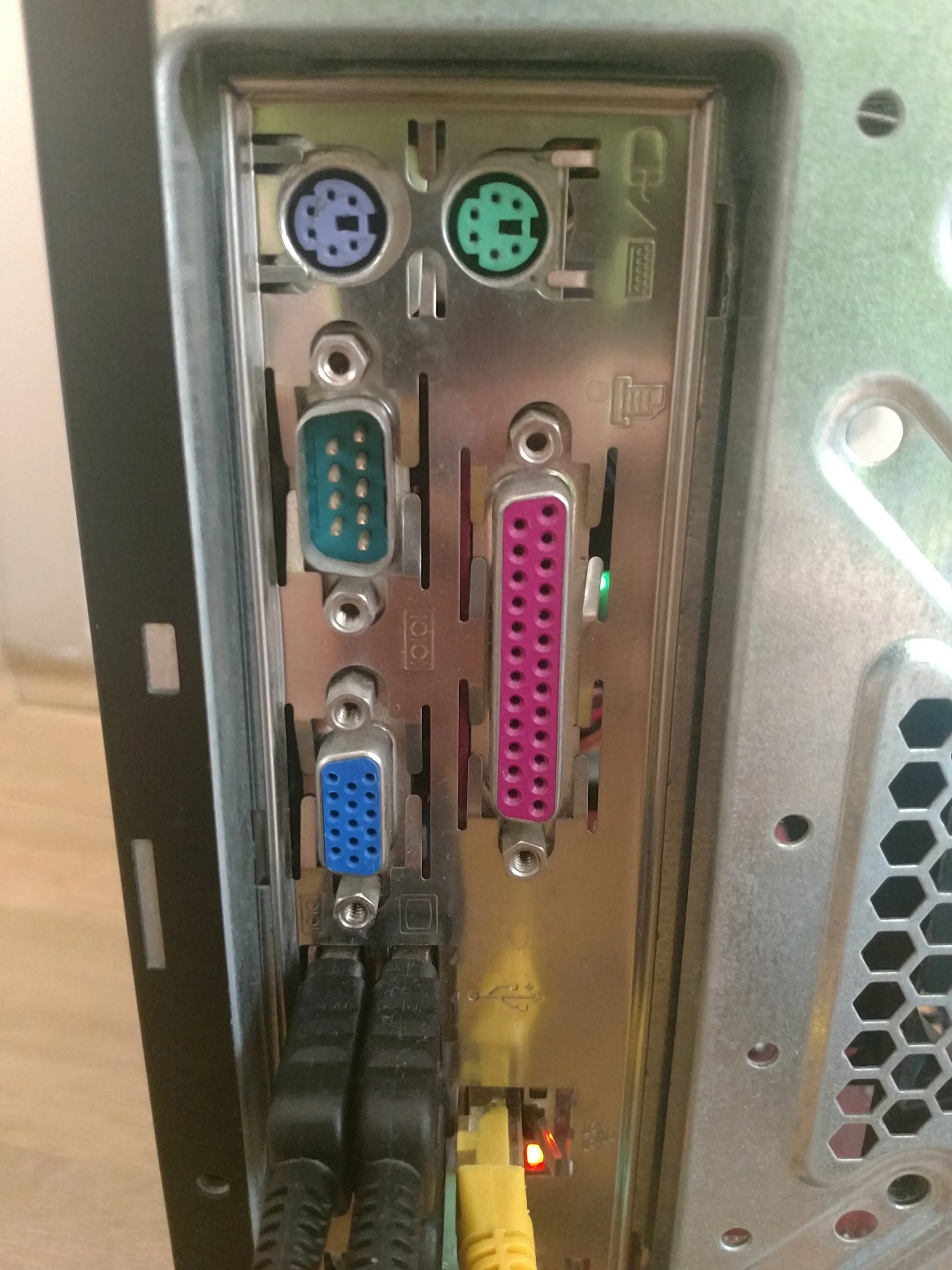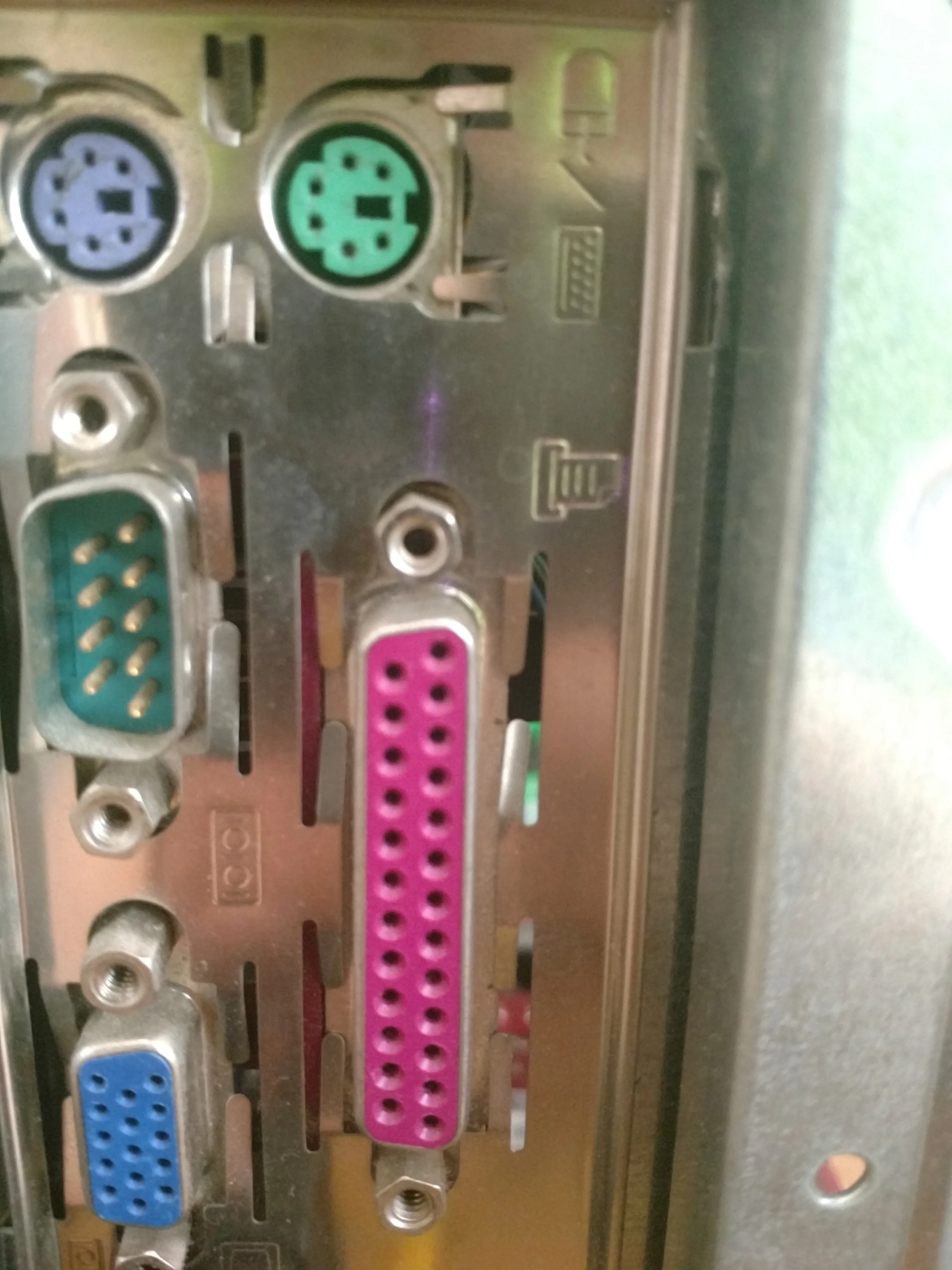 Pembe olanın yanında yazıcı işareti var sanırım paralel port denilen şey. Yeşil olanda değisik yan yana iki ekran gibi bir logo var aynısından vga nın yanında da var ama vga girişin yanında farklı ekran logosu gibi bir şey daha var( vga nın sol altındaki logoyla yeşil olanın sağ altındaki )