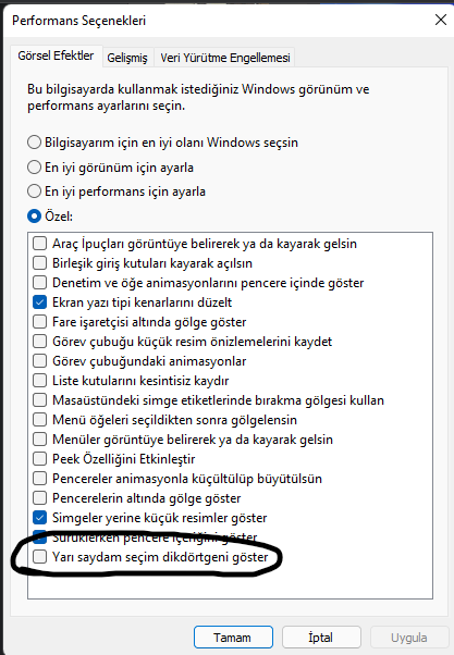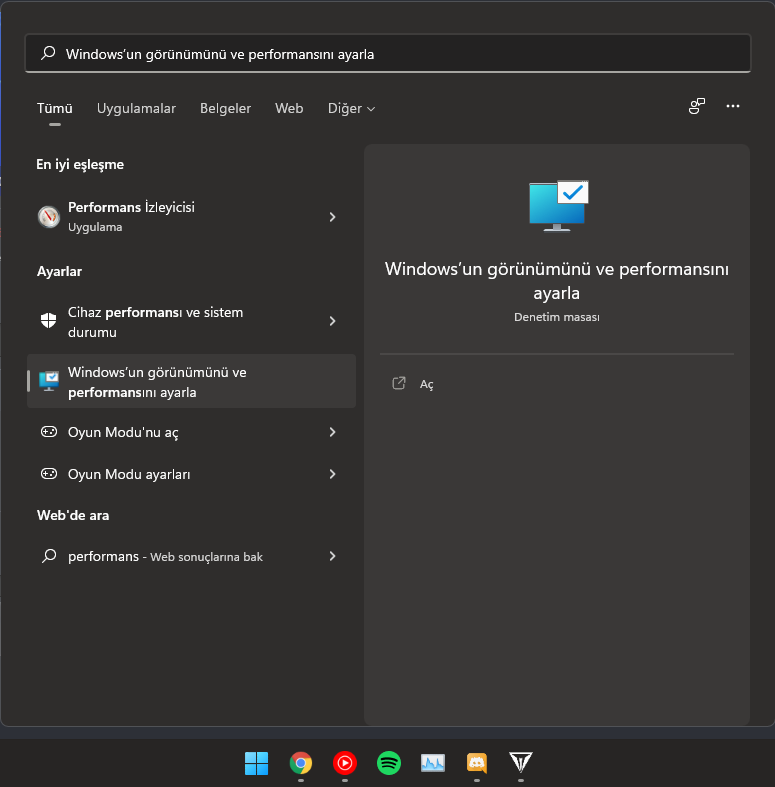 Arama kısmına "Performans" yazarsan o isimde bir ayar görebilirsin.