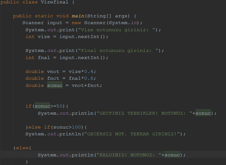 Selamlar. Bu kodda vize ve final notlarını hesaplatmaya çalıştım. Notların 100'den fazla çıkması durumunda da geçersiz not diye bir yazı yazmasını istedim. Fakat 100'den büyük olduğu halde de dersten geçildiği kabul ediliyor. Nasıl bunu düzeltebilirim ? Teşekkürler. Bu arada dil Java programlama dilidir.