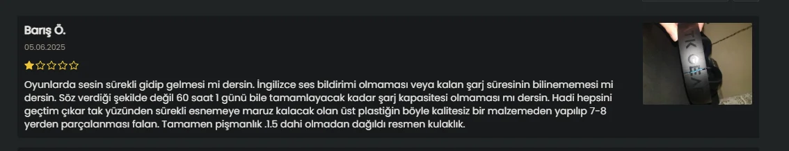 İncelemelerine de bakabilirsiniz, benim gibi iki kişi daha sorun yaşamış. Foruımlarda ve YT yorumlarında da sorun yaşayanlar gördüm. Dediğim gibi kulaklık ağırsa ve taşıyan mekanizma kötü ve sert plastikse (mesela ATK N9, Havit kulaklıklarında kullanılanlar veya arkadaşın ilk mesajda attıklarında biraz daha böyle esnek bir plastik var) kırılıyor. Ayrıca üst kısım ve kulaklığın bağlantı kısımları da tasarım için kötüyse kırılıyorlar.
