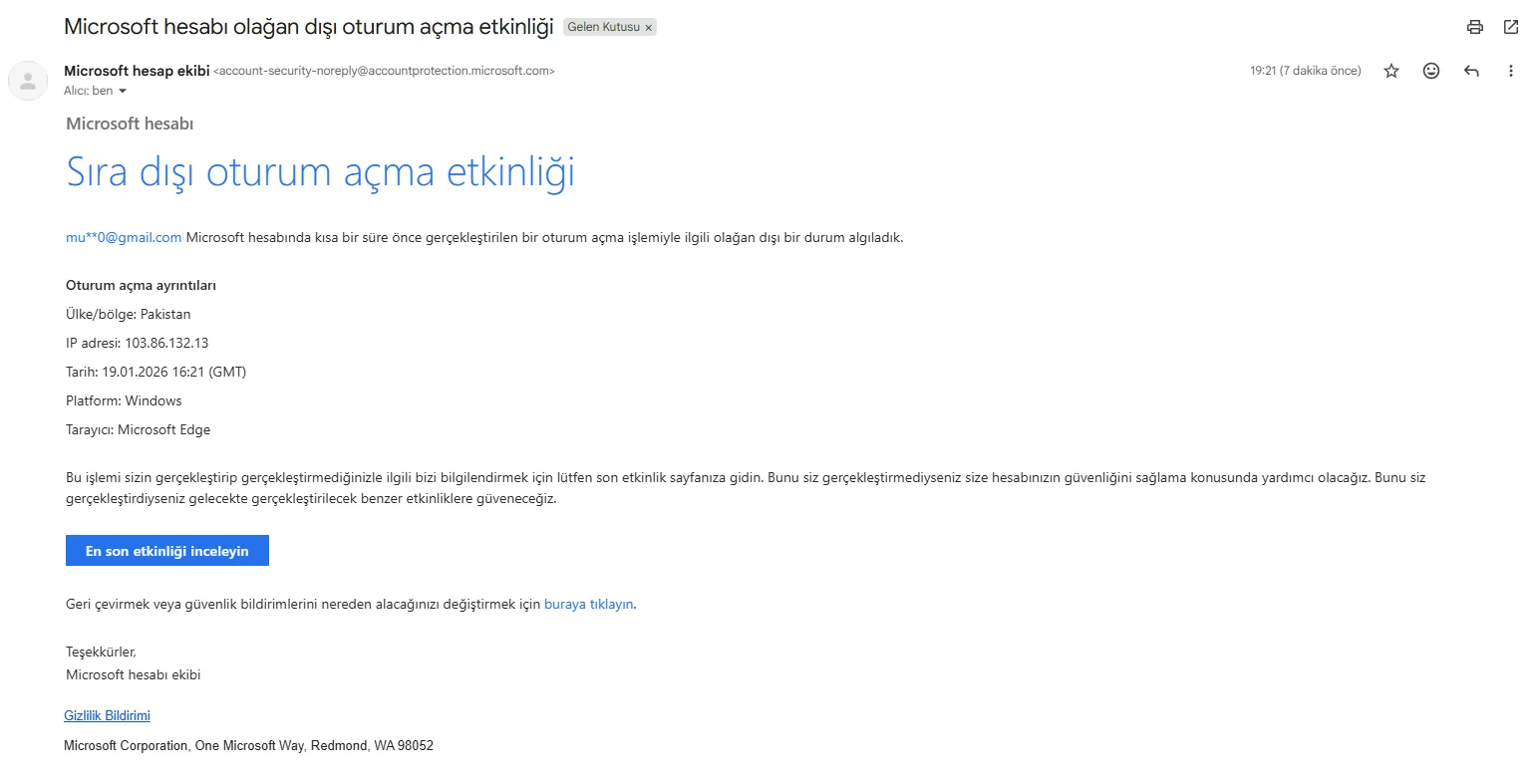 Böyle bir mail geldi gelen mailde bahsedilen hesap gmail hesabı yani microsoft ne alaka bilmiyorum. Mailimin oturum açmasına baktım farklı bir şey görünmüyor. Hesap sahte mi ?