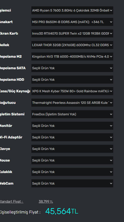 Kailiteye önemverdim ve bütçem 40 bin 6 bin indirmemiz lazım daha fp anakart ve kasa ve güç kanağı