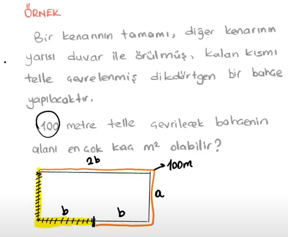 Uzun kenarın yarısı telle yarısı duvarla çevrili, yarısına b demiş. Kısa kenara da a demiş.