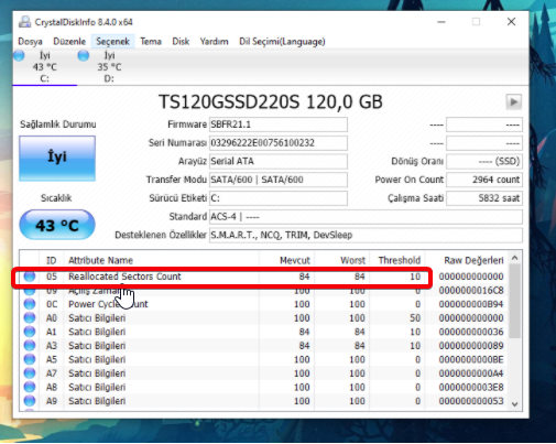 Edit: RAW değerini 10 sandım. Sıkıntı yok. Eğer RAW değerinde 10 yazsaydı SSD'nin işi bitmişti. Threshold yedek sayısı. Bir an kafa gitti.