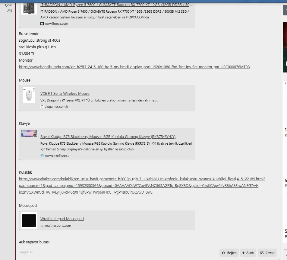 40K bütçe ile böyle bir sistem topladım iyi mi? Oyunları orta-yüksek ayarlarda oynamayı düşünüyorum. Oynamayı düşündüğüm oyunlar da Battlefield 1, Valorant, Rainbow 6, LoL, Phasmophobia, Dead By Daylight, Minecraft, Lethal Company gibi aşırı sağlam bir sisteme ihtiyacı olmayan oyunlar.