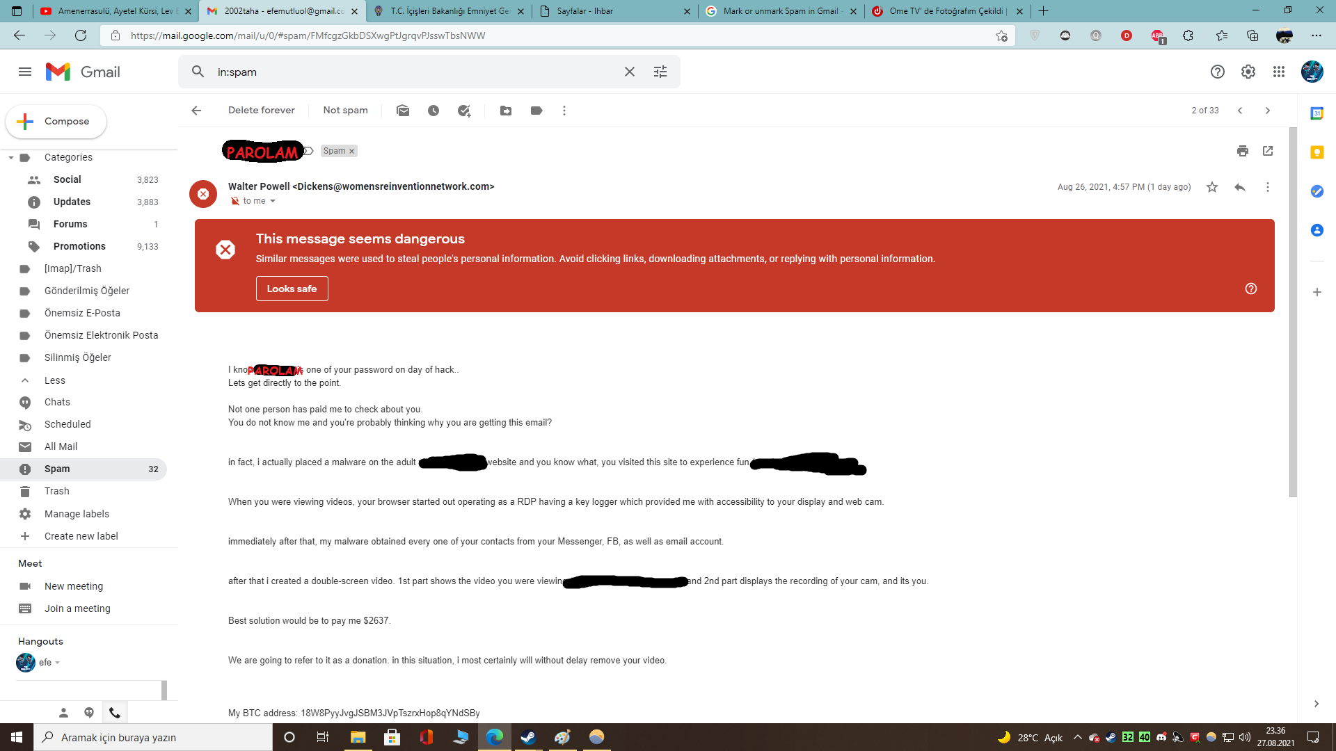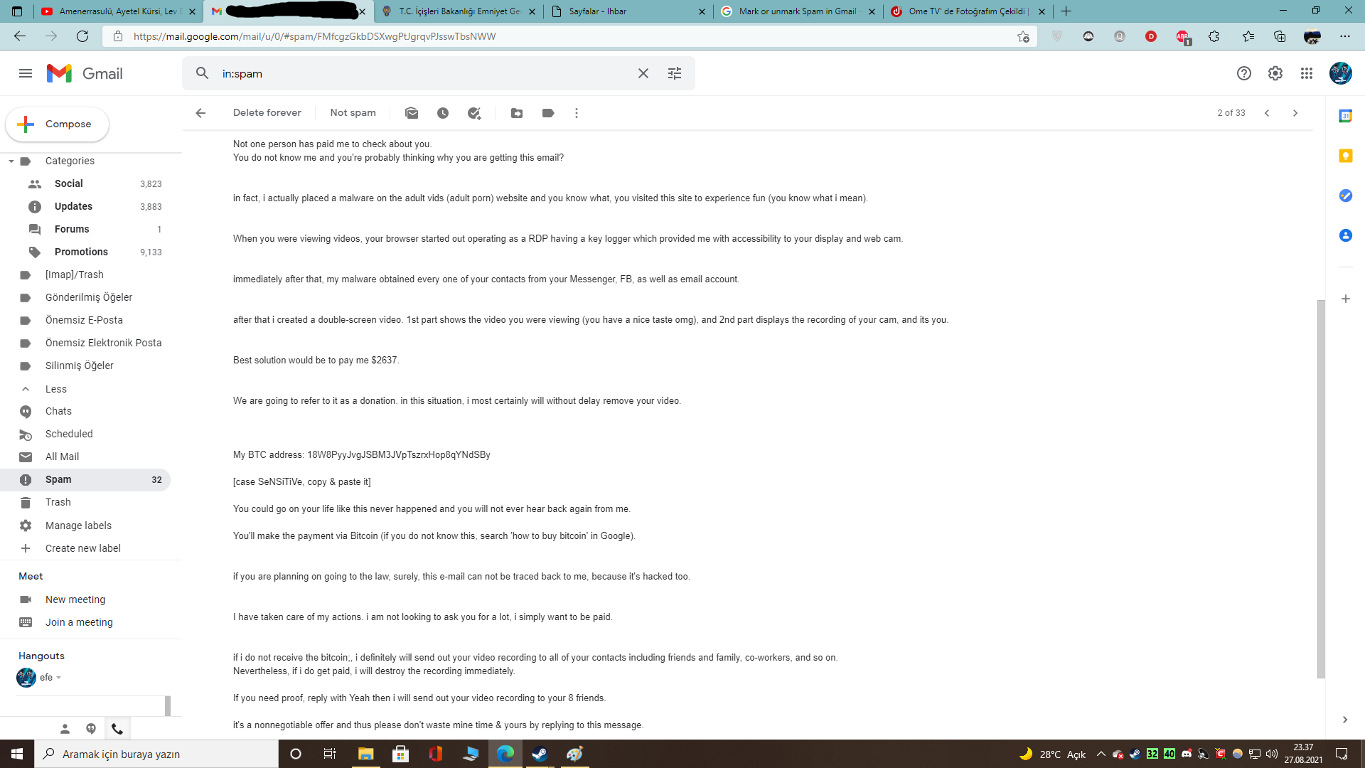 Arkadaşlar bugun ilginç bir olay yaşadım.Saçma sapam bir spam aldım normalde önemsemem ama bir parolam doğru bilinmişti. Tabi size sormak istedim, ne düsünürsünüz? Sansürlü.