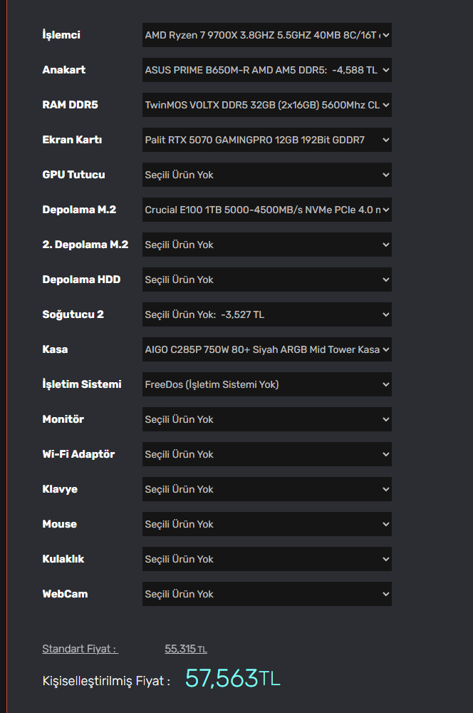 57k etmesi lazım parçaları giriş seviye değil kaliteli seçtim.