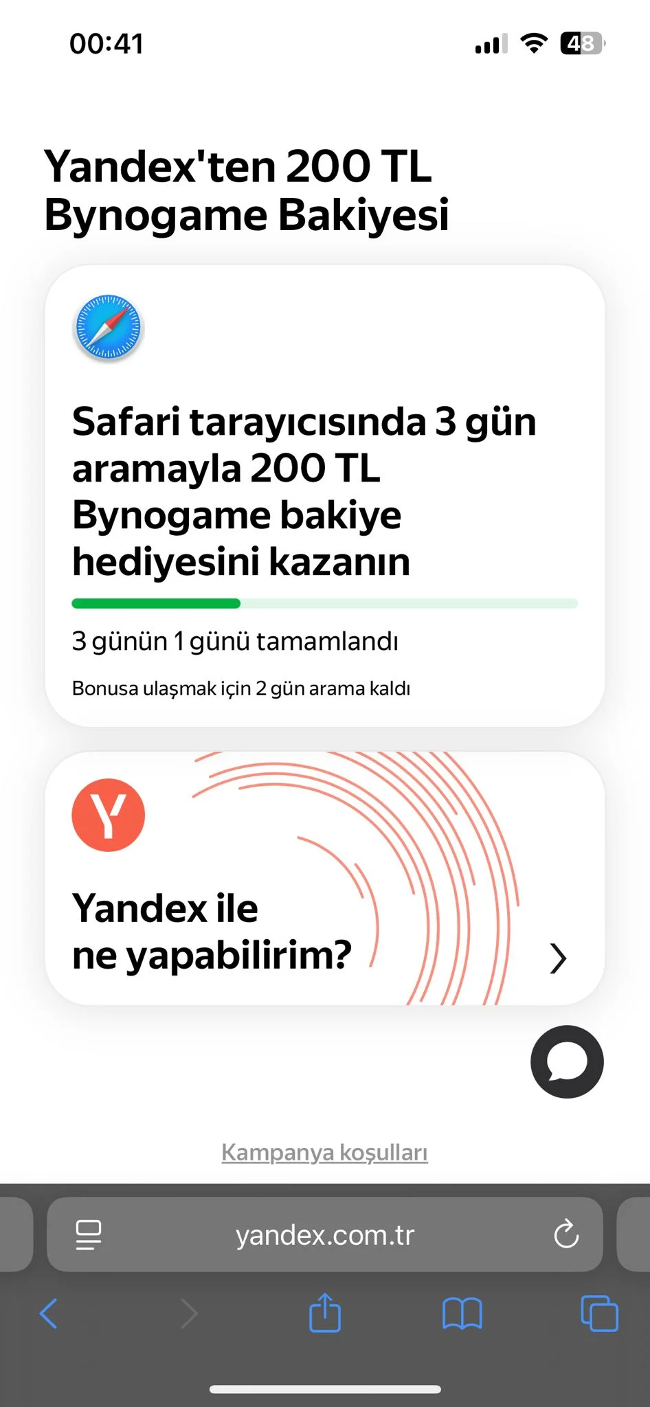 https://blog.bynogame.com/yandexten-200-tllik-bynogame-bakiyesi-hediye-2602 arkadaşlar bende bilgisayarda çalışmadı telefonda çalıştı bazılarında bilgisayardada çalışabilir bilmiyorum öncelikle kampanyaya göz at kısmına tıklıyoruz https://yandex.com.tr/portal/defsea...kg2r1UruXu51085&offer_type=8kLEiFH1UruXu51098 buraya atıyor burada yandexi varsayılan tarayıcı yapyıoruz sonra bir kısımda telefon numaramızı isticek eğer girmezseniz olmaz 3 gün boyunca hergün bir arama yaaprsanız 3 iş günü boyunca 200 tlik bakiye hesabınıza ekleniyor hayrılısı olsun son olarakda böyle bi ekran gelemsi lazım en son soruları olan arkadaşlar aşşağıya yazabilir GİZLİ SEKME VEYA VPN İLE ÇALIŞMIYOR