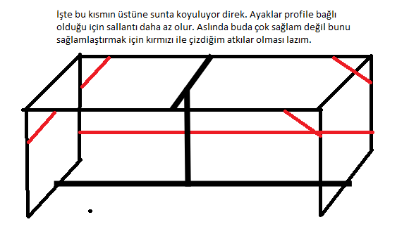 Evet o demirlerden bahsediyorum. Bak şimdi olay şu. 4 taraflı alttan döndüğü için ayaklar profil demirlere bağlanıyor. O yüzden daha az sallanıyor. Ama senin dediğin masada ayaklar direk suntaya bağlı ve birbirinden bağımsız olduğu için daha fazla sallanıyor. Çapraz demir olmasının hiç faydası yok. Zaten sağa sola sallandığı için ''X'' demirin ortası vida ile tuturulduğundan o vida oynuyor. bu sayede hiç faydası olmuyor. ''X'' demiri birbirine kaynaklı olsaydı azda olsa faydası olurdu mesela.