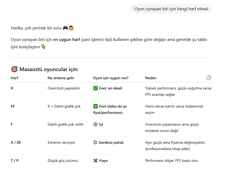 Atıp tutma birader. Herhangi bir konu hakkında hazırcı değilim. Oyun oynayan biri için hangi işlemciler daha uygun olur şeklinde gptye soruyorum. Böyle bir cevap verince merak ettim birde insanlara sorayım dedim ama senin gibi insan dışı varlığa denk geldik :d