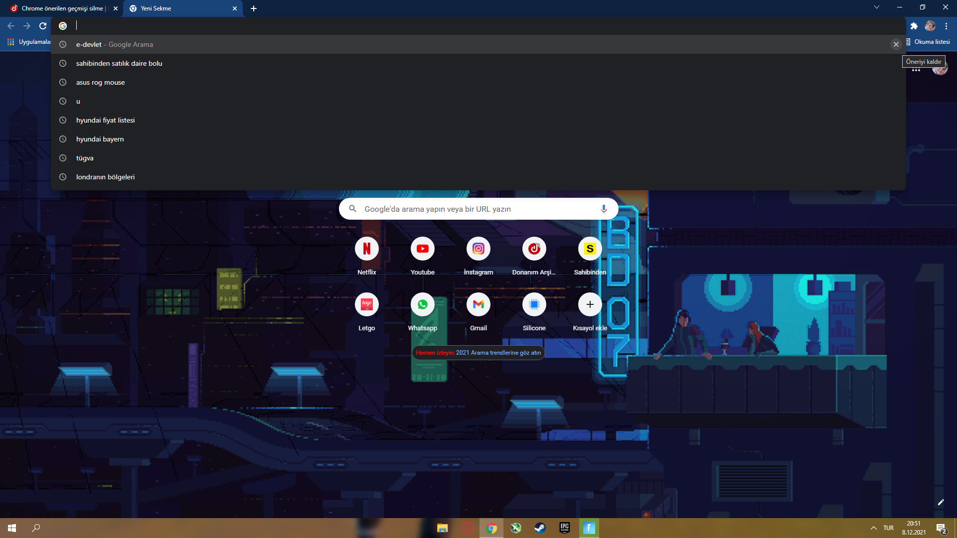 T Trowlking 80+ Bronze Katılım 30 Mart 2020 Mesajlar 1,061 Reaksiyon skoru 220 8 Aralık 2021 #1 Chrome de arama yerine tikladigimda önerilen geçmiş çıkıyor geçmişi sildigimde gitmiyor napmaliyim