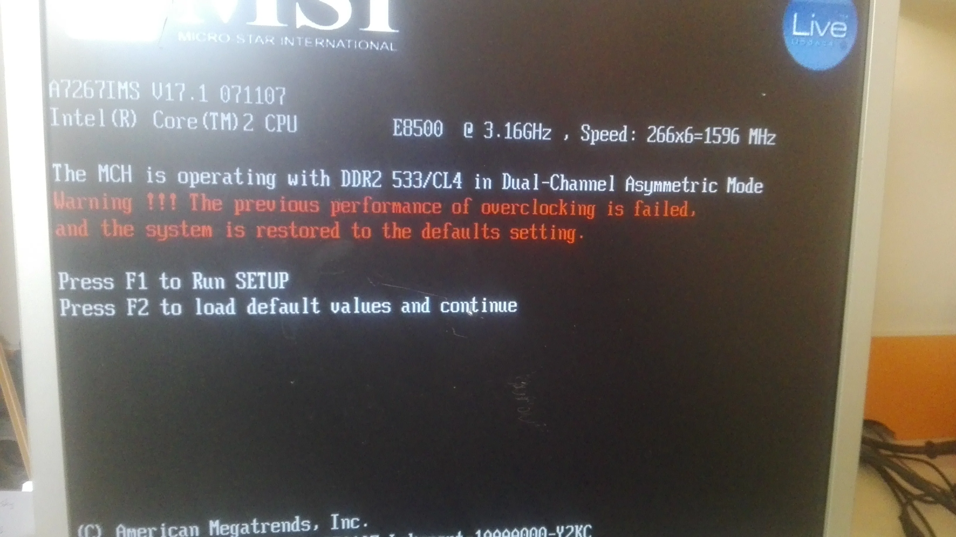 İntel pentium e2180 2.0ghz 1 mb önbelleğe sahip işlemci kullanıyordum ve işlemcimi değiştirme kararı aldim Intel pentium e8500 3.16 ghz 6 mb önbellek çift çekirdekli işlemci aldım taktım ve açtığımda hata verdi (Fotoğrafını ekliyorum)
