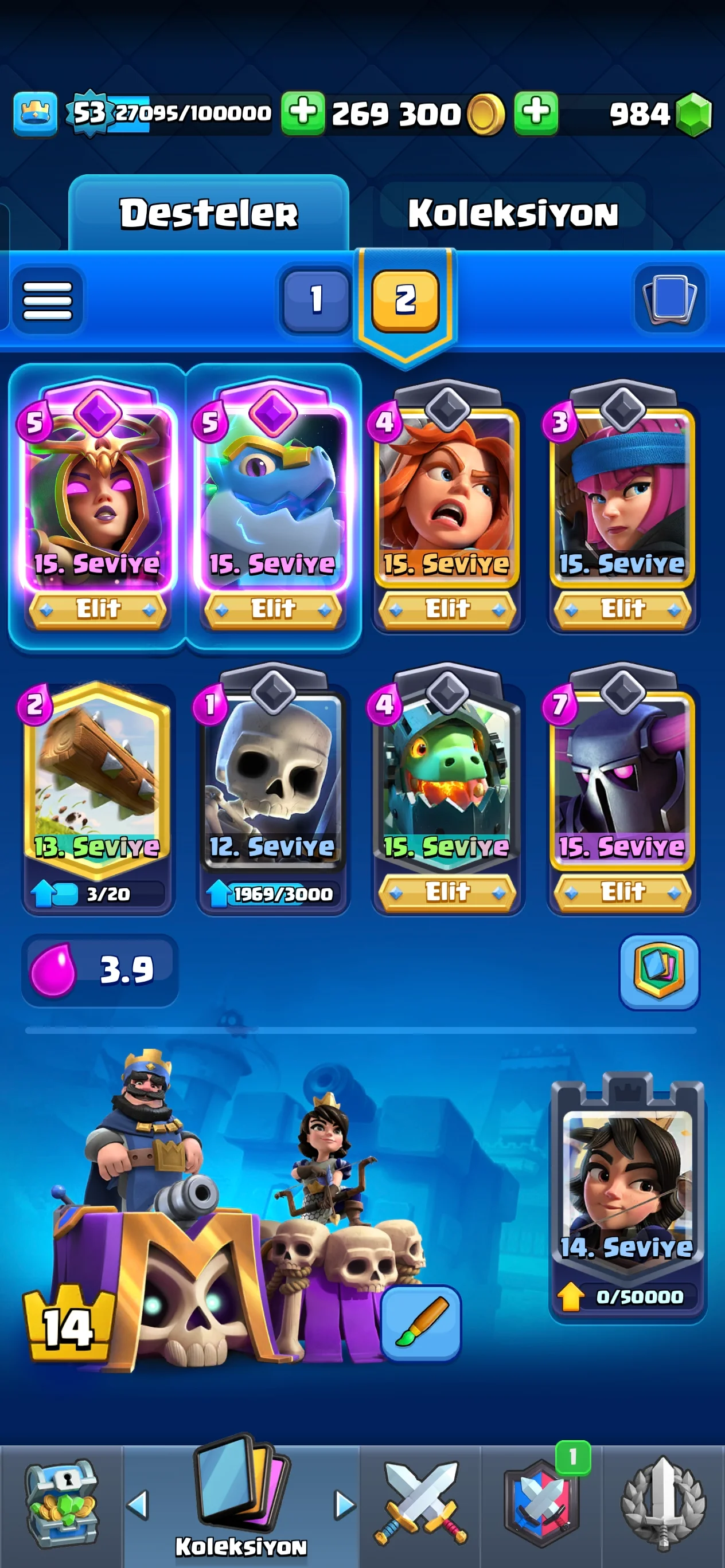 Bir türlü 10.000 kupa olamıyorum 2 gündür 1 kazanıyorum 1 kaybediyorum 2 kazanıyorum 2 kaybediyorum 3 kazanıyorum 2 kaybediyorum kafayı yedim ne önerirsiniz destem bu (destedeki yüksek levelli kartları kullanarak böyle bir deste oluşturdum) 9500e bu desteyle çıktım ama 10.000e çıkamıyorum tıkandım buarada mega şovalye ile teslada 15 level ve teslanın evrimi de var.