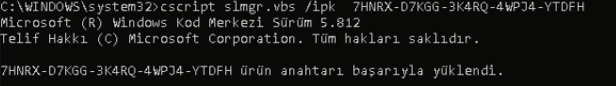 9) şimdi cmd'yi tekrardan açalım ve oraya demin yazdığımız kodun yanına sizin Windows modelinizin anahtarını yazın ve enter a basın
