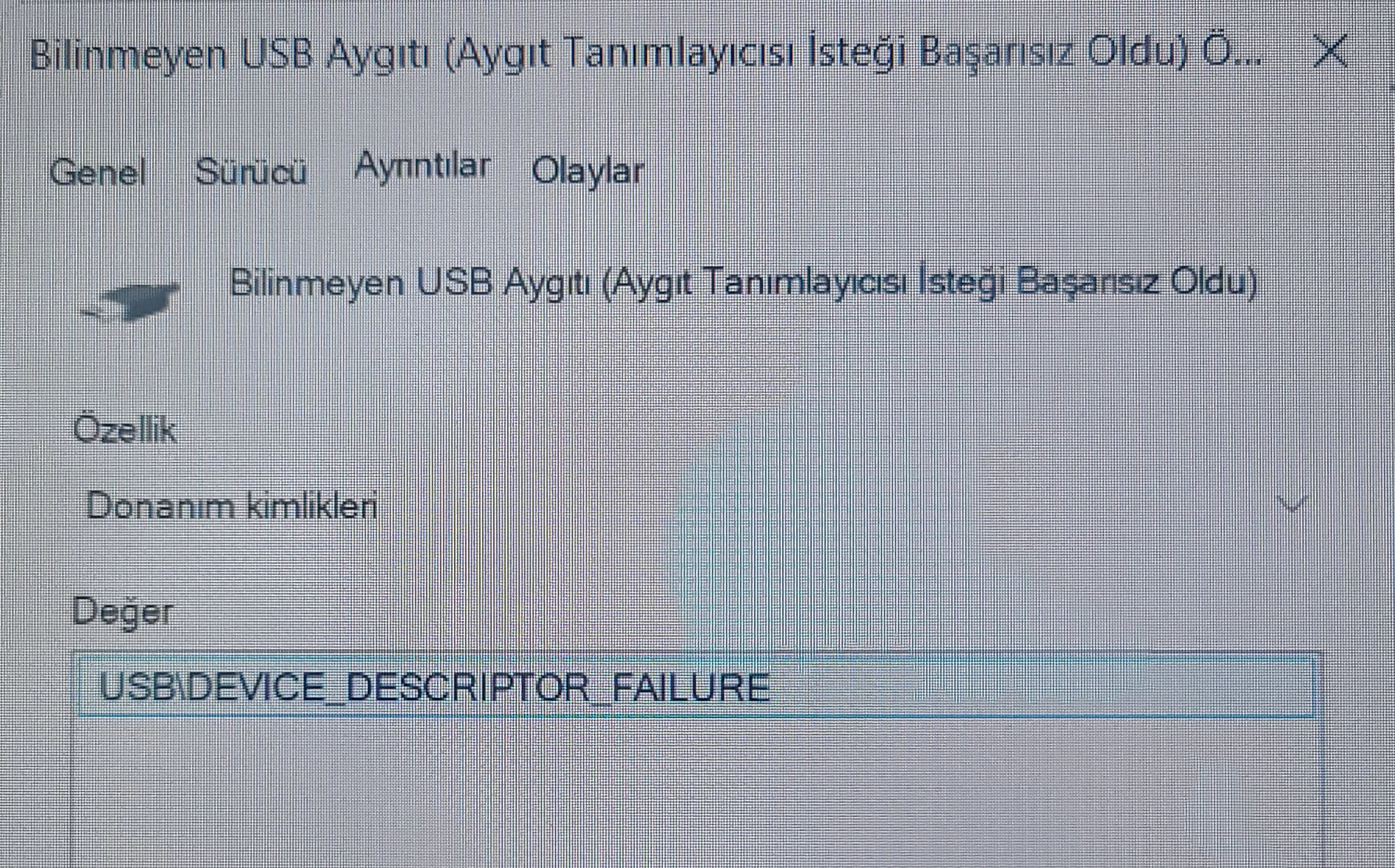 Aygıt yöneticinden baktım donanim kimliği : Usb/Device_descriptor_failure