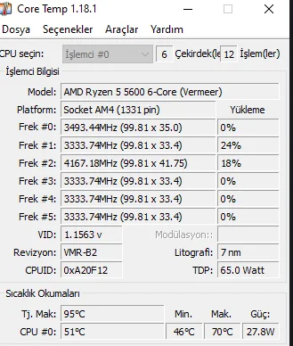 5600 çok güç tüketen bir işlemci değil isterse çok rahat 35-40c boşta değerler alabilir. Büyük ihtimalle voltaj yüksektir.
