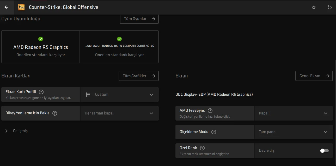 Herkese iyi forumlar. Bugün birkaç el attıktan sonra ekran kartıma yeni güncelleme geldiğini görüp indirmeye başladım. Windows Update geldiğini gördüm onuda güncelledim. Sonra tekrar oyuna girdim ama siyah barlar gözükmeye başladı. AMD ayarlarından ölçekleme modu kapanmıştır dedim baktım hiçbir şekilde yanlışlık yok. Siyah barları nasıl kapatırım? (Resimlere CS:GO'yu ayarlarını eklemedim ama ordaki ayarlarda doğru.)
