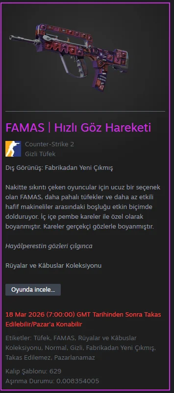 Kuscuesref34 80+ Katılım 4 Aralık 2023 Mesajlar 171 Reaksiyon skoru 39 10 dakika önce #1 Herkese iyi forumlar açtığım kasadan bu silahı çıkarttım fakat steam pazardakileriyle arasında çok büyük float farkı var bunu daha pahalıya satabilir miyim bilen varmı Ekler Ekran görüntüsü 2026-03-15 035942.webp 32.2 KB · Hit: 0