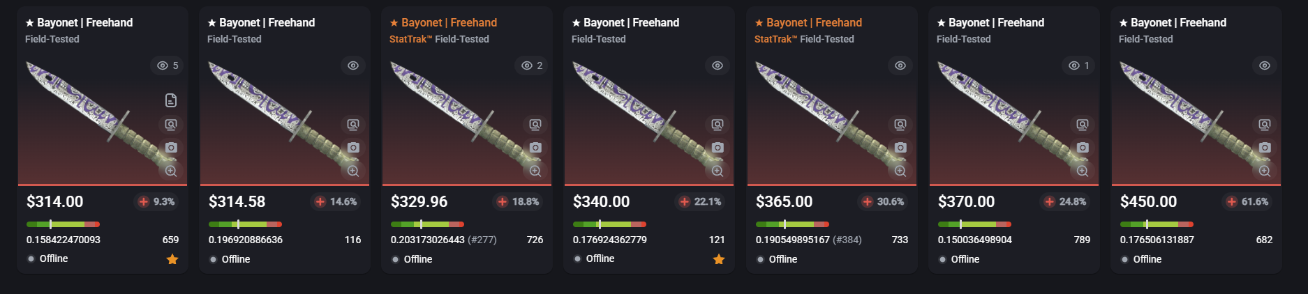 Arkadaşlar bir skinlere bakıyordum önüme bayonet freehanbd geldi ve burada en düşük 271 dolar diyordu. Ama Steam pazarda olsun veya diğer sitelerde daha pahalı gösteriyor bu CSFloat'ta skin alma mantığı mı değişik olayı bilen açıklayabilir mi?
