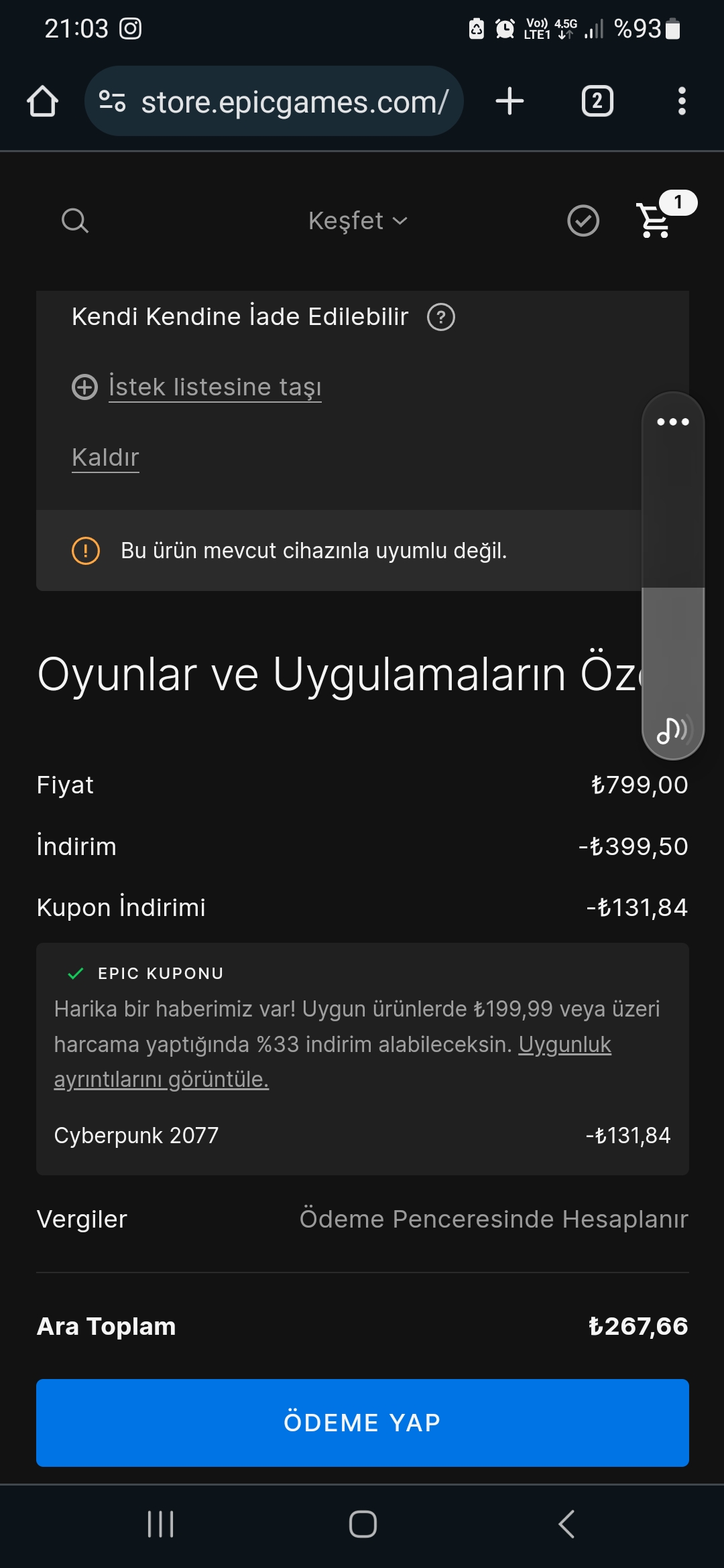 Arkadaşlar epic games 200 tl üzeri %33 indirim ve cuberpunk kendi indirimi ile baya ucuza geliyor,