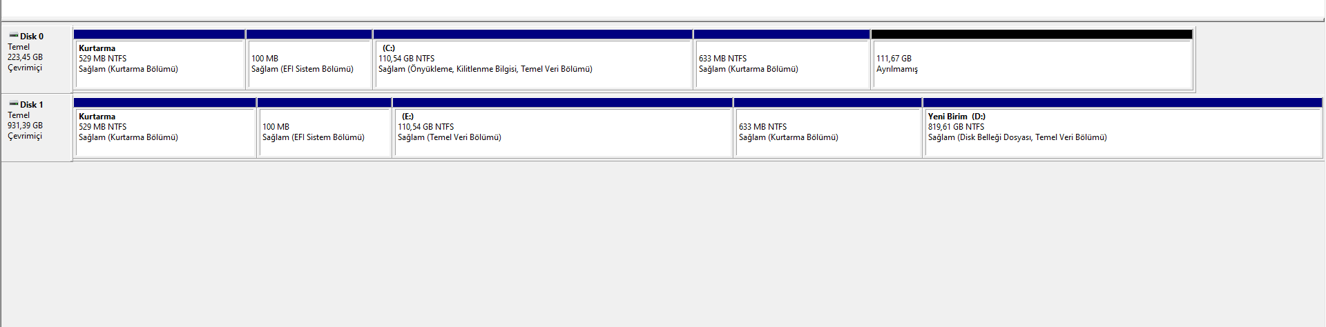 Arkadaşlar yeni bir SSD aldım, Windows'u içine atayım dedim. Harddisk ikiye bölünmüştü ben de Windows'un olduğu kısmı klonladım ama bu işlem de SSD'yi ikiye böldü. Şimdi ise böyle karışık bir şey oldu.