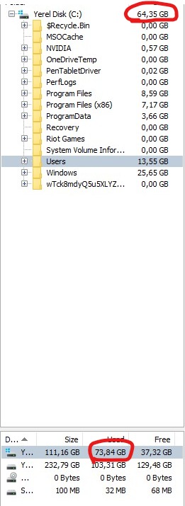 C diskimde 9GB kadar kayıp bir alan var. Dün yeni bir ekran kartı takıp sürücülerini kurdum, ve bir anda boş alan 42GB'tan 36GB civarlarına düştü ama bu kadar yer kaplayacak bir kurulum yapmadım. Bu yüzden mi oldu bilmiyorum. Geçen günlerde de durduk yere aynı durumu yaşamıştım. Bunun sebepleri neler olabilir, bilgisi olan anlatabilir mi? (120GB'lık bir SSD, donanımsal bir sorun olduğunu düşünmüyorum.)