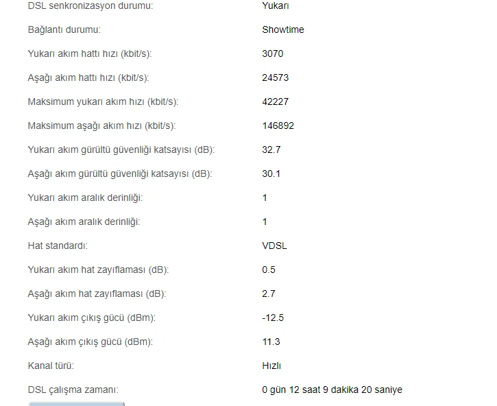 Hocam 192.168.1.1 girip giriş yaptıktan sonra gelen sayfa genelde TEMEL DURUM olmakta ordan DSL bölümündeki bu değerleri paylaşmalısınız. dB, dBm gibi yazılar varsa alın görüntüyü atın buraya bakayım.Ben neden bulamadım bunları?