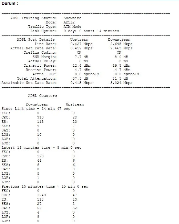 Kötü bir değerler ADSL için acayip kötü. Sanırım telefon kutusundan sonraki size gelen kablo kötü olabilir.En net bu şekilde paylaşabiliyorum. yardımlarınız için şimdiden teşekkürler...Alıntıyı görüntüleAlıntıyı görüntüle