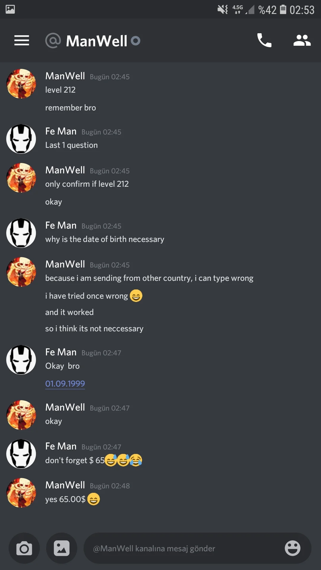 Steam den konuşuyorduk dc ye geçtik başta pek inanmıyordum sonra itemi gönderdim dc den de engelledi steam den de