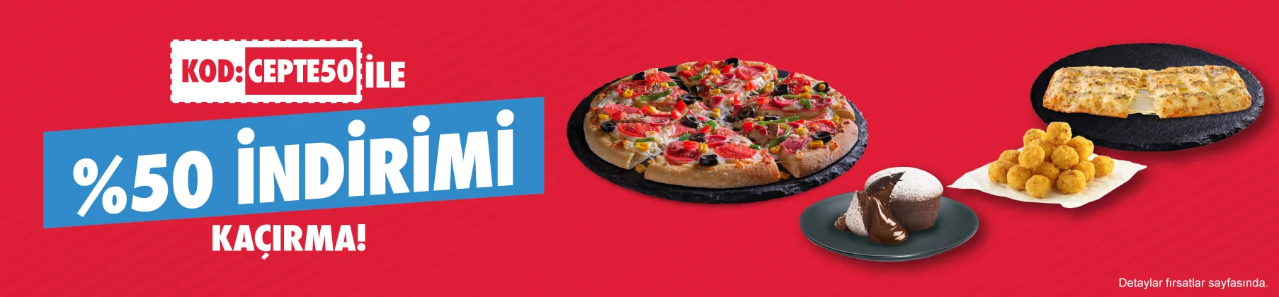 •Kampanya, Domino’s uygulamaları ve Dominos.com.tr web sitesinden kampanya dönemi boyunca CEPTE50 kodu ile verecekleri eve servis siparişlerde sepette %50 indirim uygular.