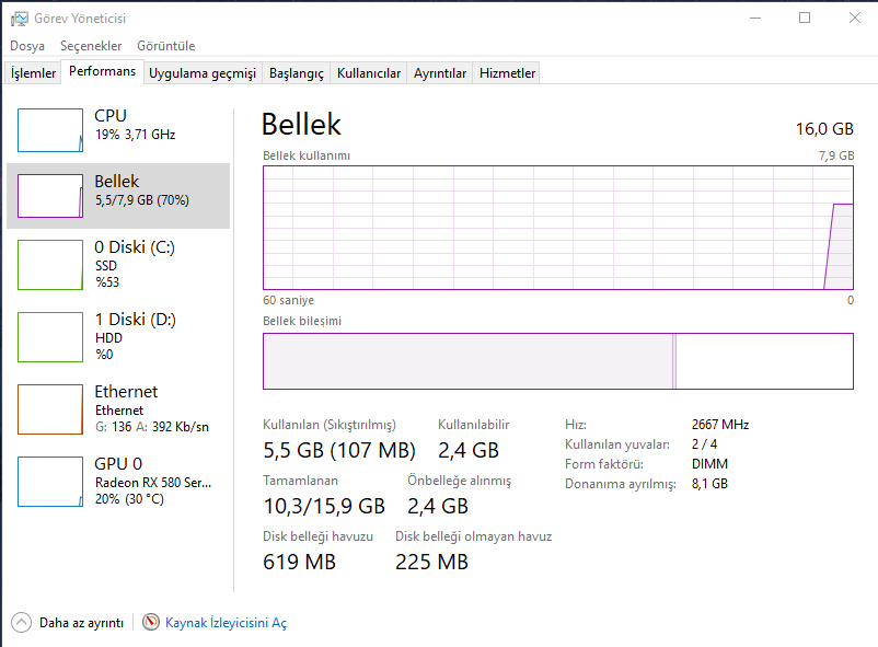 16 gb ramin 8 gb si donanıma ayrılmış diyor önceden ekran kartı güncel değilken bunu yapıyordu şimdi o da güncel fakat yine bu şekilde