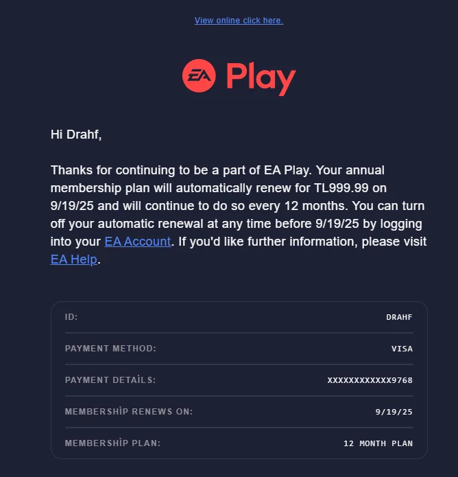 Evet arkadaşlar geçen yıl olduğu gibi aynı şekilde EA Play Pro üyeliğinin 999 TL üzerinde yenileneceğine dair mail geldi. Geçen yıl EA Play Pro ücretinin 120 Dolar'a güncellenmesine rağmen bu şekilde mail gelmişti ve eski kullanıcı olarak 999 TL üzerinden yenilemiştik. Umarım bu yılda mailde belirtildiği gibi 999 TL üzerinden yenilenir. Mail gelen arkadaşlar ödeme yöntemlerini kontrol etmeyi ve güncellemeyi unutmasın.