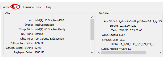 Sonra dxdiag dan bak