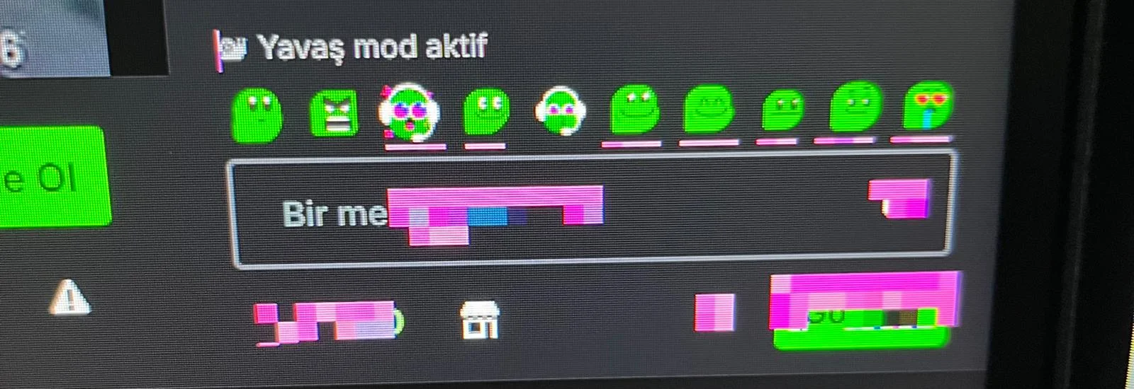 Merhaba arkadaşlar yeşil platformda yayın izliyorum ve sadece orada fotoğraftaki gibi sıkıntı yaşıyorum. Genellikle chat kısmında pembe görseller oluşuyor. Tarayıcı da değiştirdim yine devam ediyor. Sorunu anlayamadım. Oyun oynarken başka bir şey yaparken kesinlikle böyle olmuyor. Sadece o yeşil platformda oluyor.