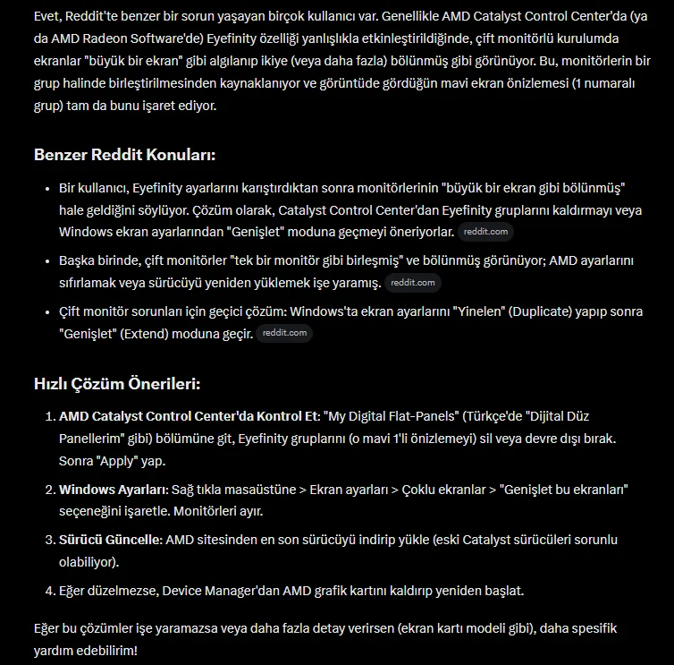 Lol oynuyordum. Ekran bir anda grimsi bir şekilde karardı ve ekran yırtılmalarına başladı. Sonra ekran geldi ama bölünmüş haldeydi. Hemde 3 parçaya. Aynalanmış gibiydi. Restart attım sorun yok ama yine ekran bölündü tek monitörde çift ekranım şuan. Yırtılma devam ediyor düzelmedi. Ekran algılama yaptım ne olur ne olmaz diye 1 aygıt görüyor olması gerektiği gibi. Daha iyi anlaşılması için foto ve video linki bırakıcam.