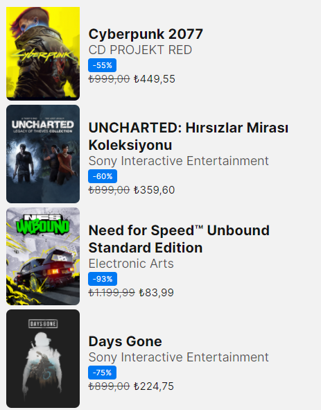 Need for Speed oynamadığım için bir şey diyemem ama onun dışın da gayet iyi. The Last Of Us için deluxe olanı almaya gerek var mı? Bir de Cyberprunk almışken DLC'yi de alın bence.Çok zor, fiyatlar arttıktan sonra hala daha indirime giriyor.