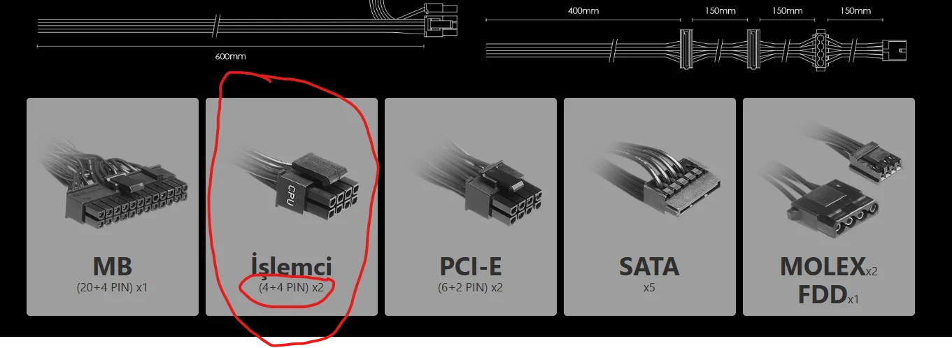 4+4 = 8 pin şeklinde o kablo. ikiye ayırabileceğin şekilde ...msi mag A650BNL 650watt