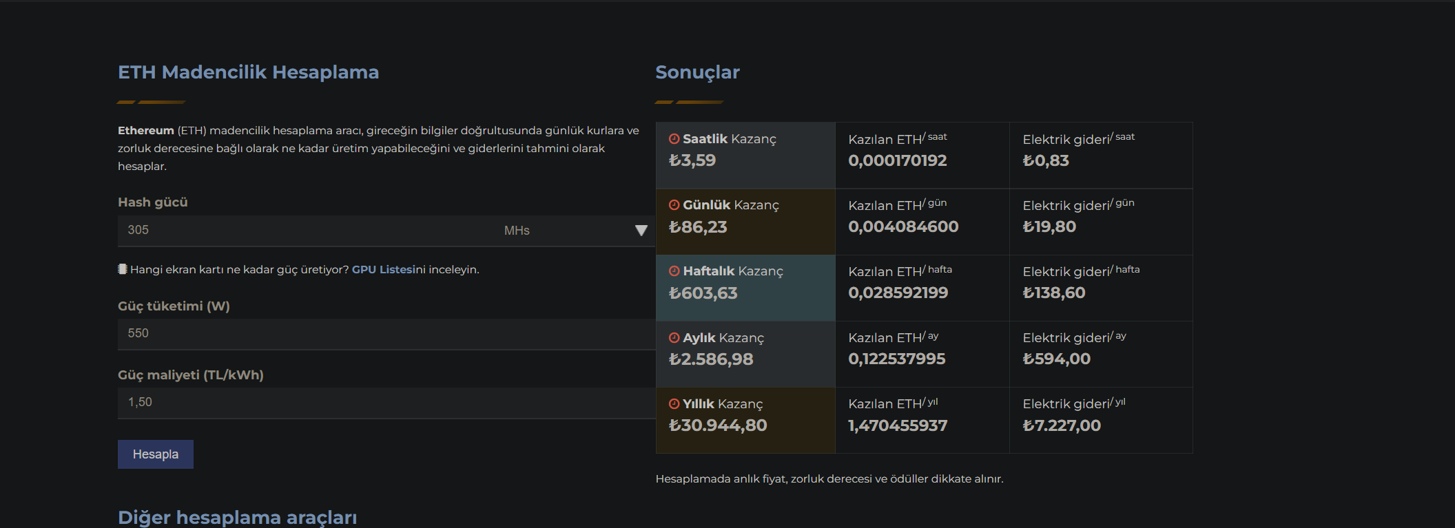 Merhabalar teşekkür ederim vermiş olduğunuz bilgiler için öncelikle şöyle bir açıklık getireyim benim temel prensibim budur herhangi biryere yatırım yapmışsam ve yahut birine borç vermişsem o paranın hepsinin birden gitme ihtimalini göz önünde bulunduruyorum giderse batarmıyım devam edermiyim çok şükür öyle bir durum söz konusu değil ve büyük kazanmak için her daim büyük oynanması gerekir.merhaba öncelikle hoşgeldiniz , bence bu gıbı yatırım işini sağdan soldan duyumlar ile yapmayın kendınız planlayın hesap kitap yapın ona göre yola çıkın amorti süresi hesaplayarak başlayabılırsınız mesela bu şekilde gelir gider hesabını https://whattomine.com/ bu siteden yapın bi not defterinde kendınız hesaplayın ve unutmayın bu bir yatırım her şey olabılır çünkü yatırım böyle bir şey her şey olabilir zarar ettiğinzide sizi üzmeyecek meblağlar ile girin şuan krıpto borsası eskiye göre daha kötü ve düşük seviyelerde fakat siz bu durumu avanataja çevirebilirsiniz ekran kartları ucuzladı 2. el de bakabılırsınız (eth kazımı da bitecek ).