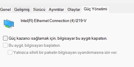 Ethernet sağ tık; özellikler, yapılandır, güç yönetimi, güç kazancı yazanda işareti kaldırın.