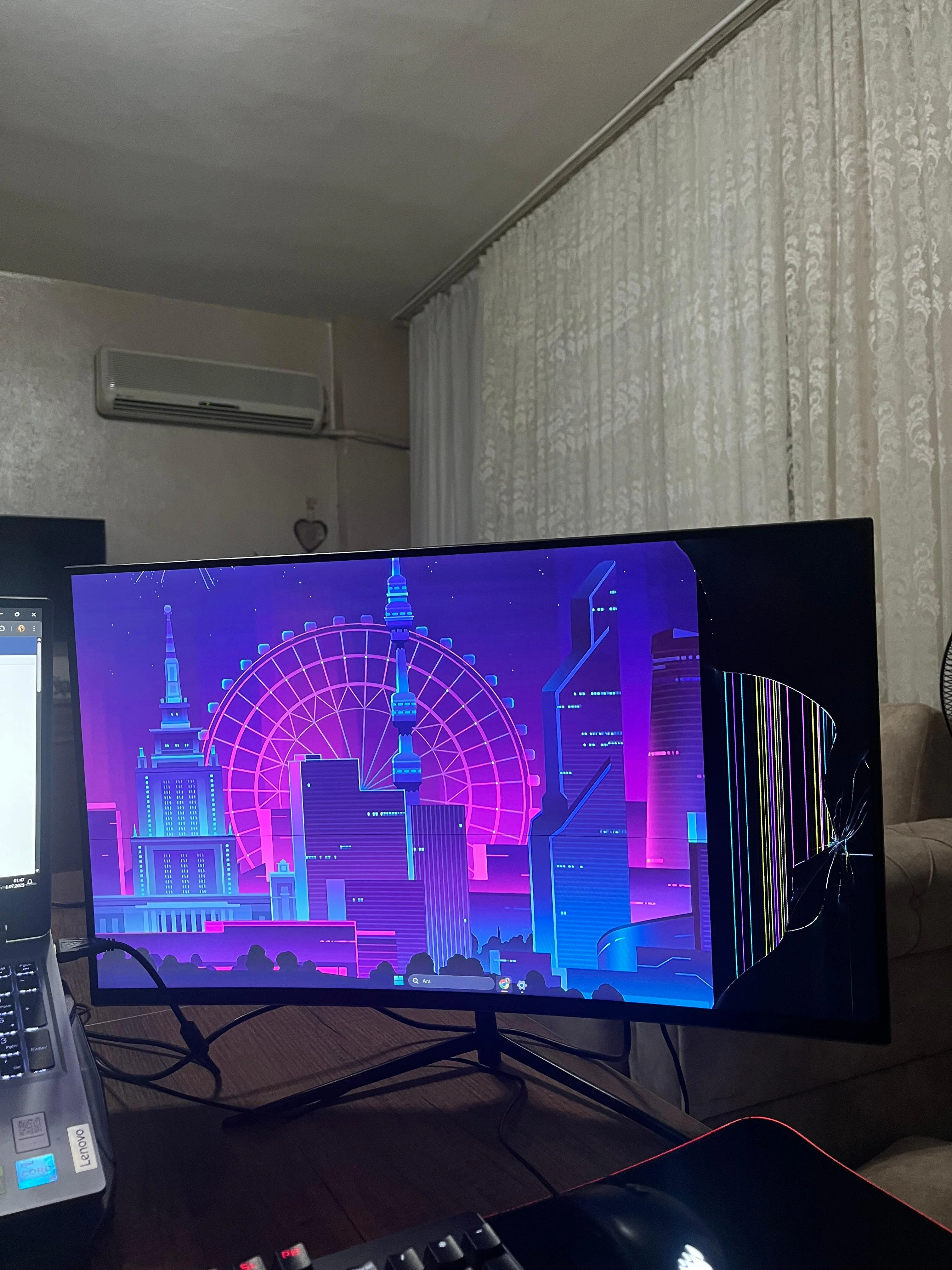 Monitörüm düşerek fotoğraftaki şekilde kırıldı. Kırıldıktan sonra işimi görsün diye 2 gün kullandım ve 2. gün sonunda kendi kendine siyah ekran verdi. Bilgisayar monitörü algılıyor fakat hiçbir şekilde ekrana yazı falan gelmiyor son halide fotoğraflarda mevcut. Yardımcı olun 7K çöp :/