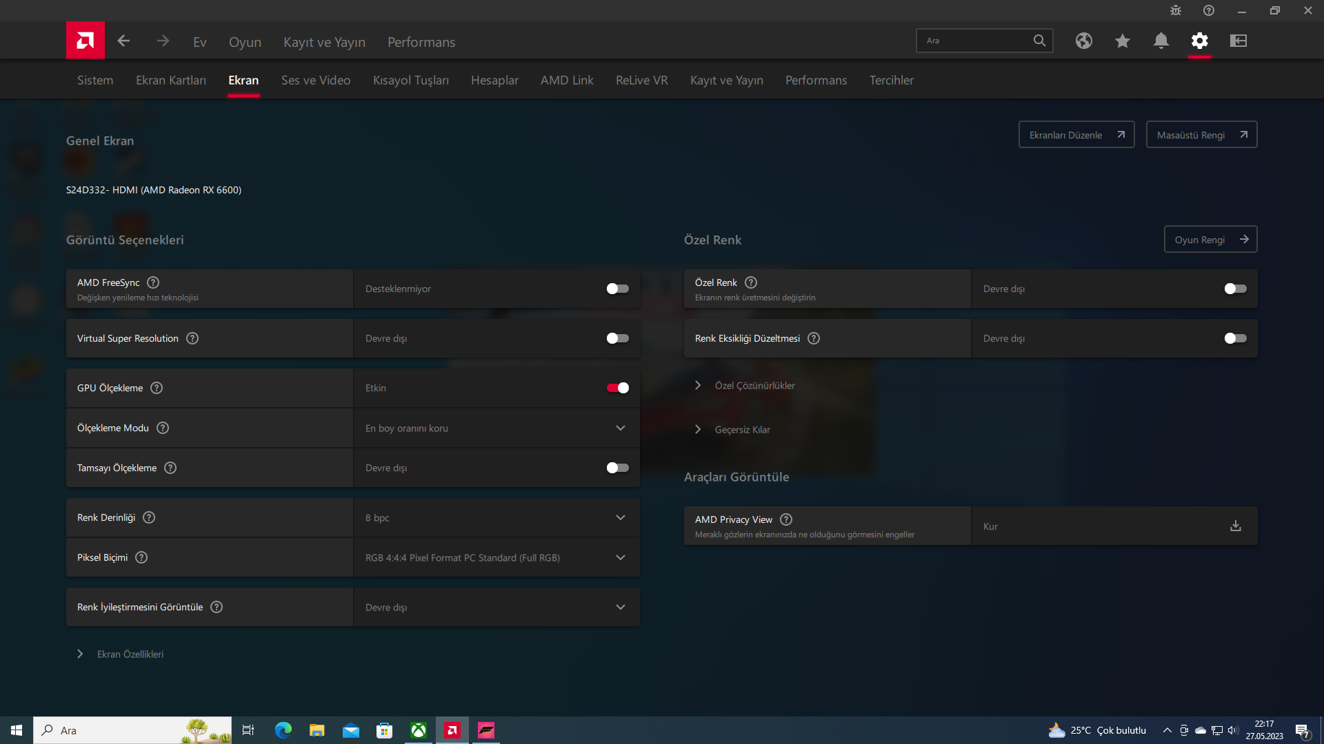 Monitör desteklemiyor bu yüzden kullanma imkanın yok hangi oyunda açmak istiyorsun ki ?Monitorum s24d332h Ekran Kartım rx 6600