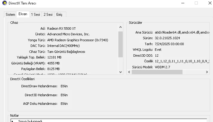 Paylaşılan Bellek: 8125 MB. Bu, sistem RAM’inin GPU tarafından gerektiğinde kullanılabilen kısmıdır. Fiziksel VRAM değildir, ancak işletim sistemi grafik işlemleri için ayırabilir.